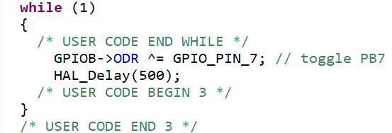 다음은 직접 소스코드를 수정해 PB7을 켜고 꺼보도록 한다.
