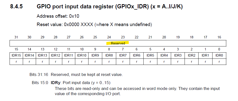 GPIOB의 IDR은 1비트짜리 16개가 있어서 실제 사용하는건 총 2바이트인데 메모리맵을 보면 Reserved 된 2바이트가 있어서 IDR이 차지하는건 4바이트이다.