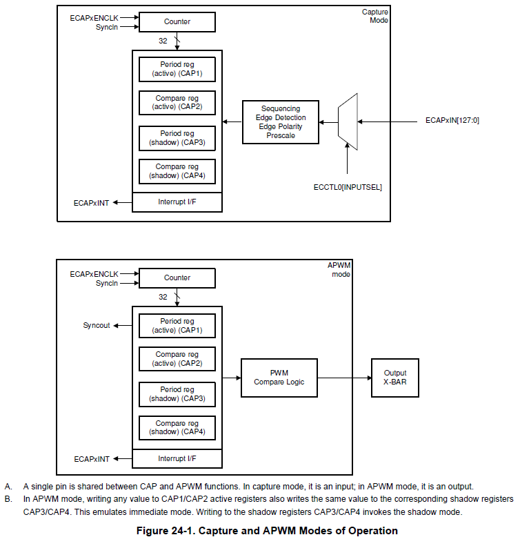 반면 eCAP 모듈을 APWM 모드로 사용할 경우 CAP1, CAP2는 액티브 레지스터로, CAP3, CAP4는 쉐도우 레지스터로 사용된다.