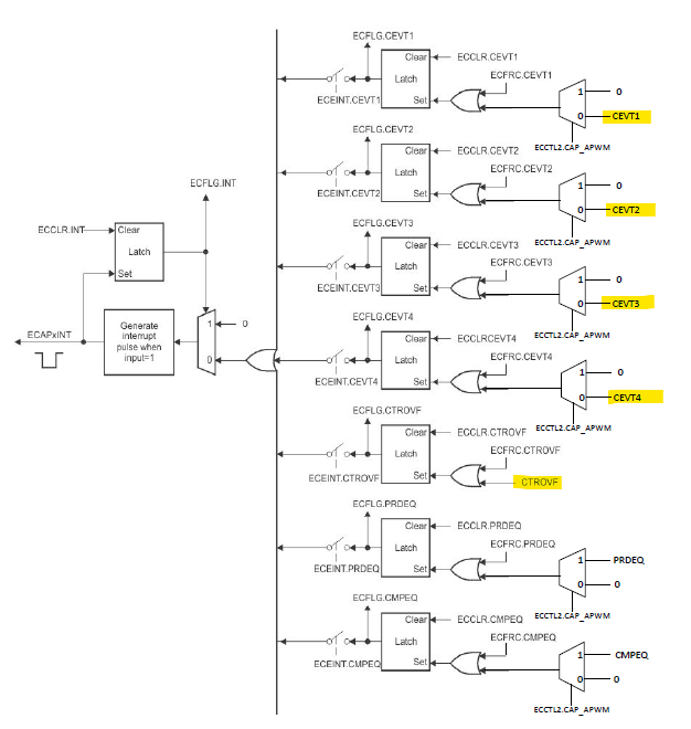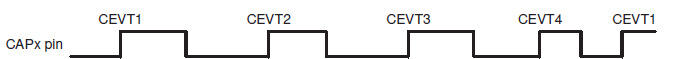 그리고 입력 신호에서 순차적으로 설정된 Edge detect 시 CEVTx 이벤트가 발생하고 ECCTL1.CAPLDEN 레지스터에 따라 CAPx 레지스터에 해당 시점에 카운팅 하고 있던 카운터 값이 로드된다.