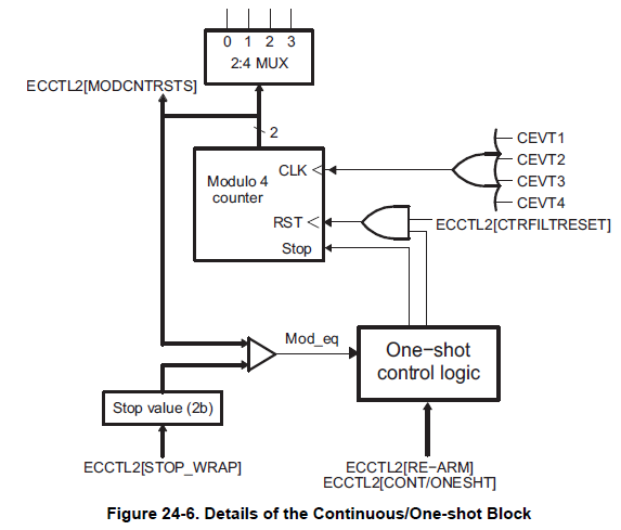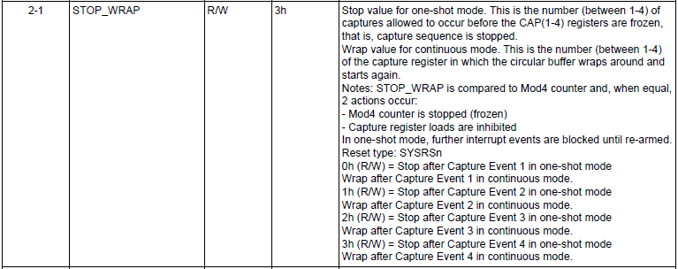 그리고 ECCTL2.STOP_WRAP 레지스터 설정을 통해 Modulo4 카운터를 어떤 값에서 STOP 또는 WRAP할 지 Stop value를 선택할 수 있고 이 bits의 리셋시 기본값은 3이다.