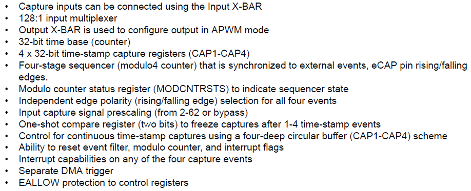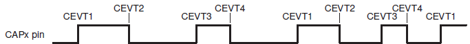 eCAP 모듈을 캡쳐모드로 사용할 경우 CAP1, CAP2, CAP3, CAP4 레지스터들은 입력받는 펄스 신호의 순차적인 edge 이벤트의 타임스탬프 카운터 정보를 저장하는 기능을 한다.