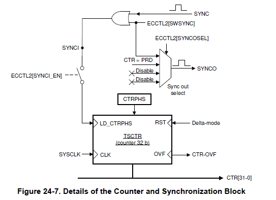 TSCTR[0-31]의 값은 캡쳐 모드로 사용될 때 입력 신호의 Edge에 의해 CEVTx 발생 시 CAPx 레지스터에 로드되는 값으로 사용되고, APWM 모드로 사용될 때는 각 모듈 사이의 위상 오프셋으로 사용된다.