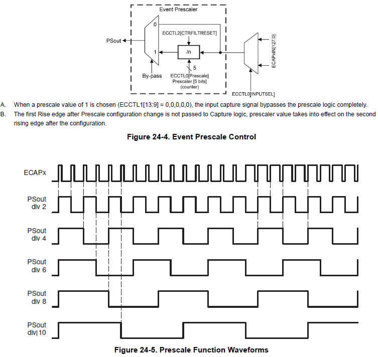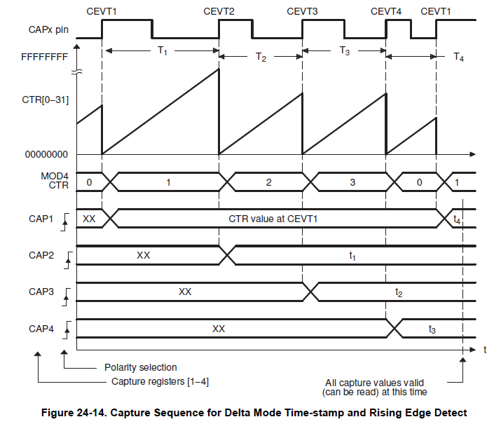 ECCTL1.CTRRSTx 레지스터가 모두 0인 경우, CEVTx가 발생할 때마다 TSCTR 카운터 값이 초기화되어, CEVT 간의 간격(Delta)을 알 수 있다.