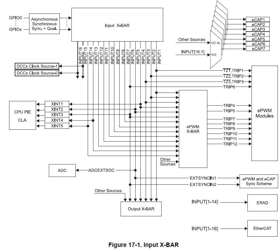 Input X-Bar는 eCAP처럼 입력신호가 필요한 모듈이 사용하는 핀을 특정핀으로 고정하지 않고, 모든 GPIO 핀중에 하나를 선택해서 사용할 수 있게하는 것으로 유연한 회로설계를 가능하게 한다.
