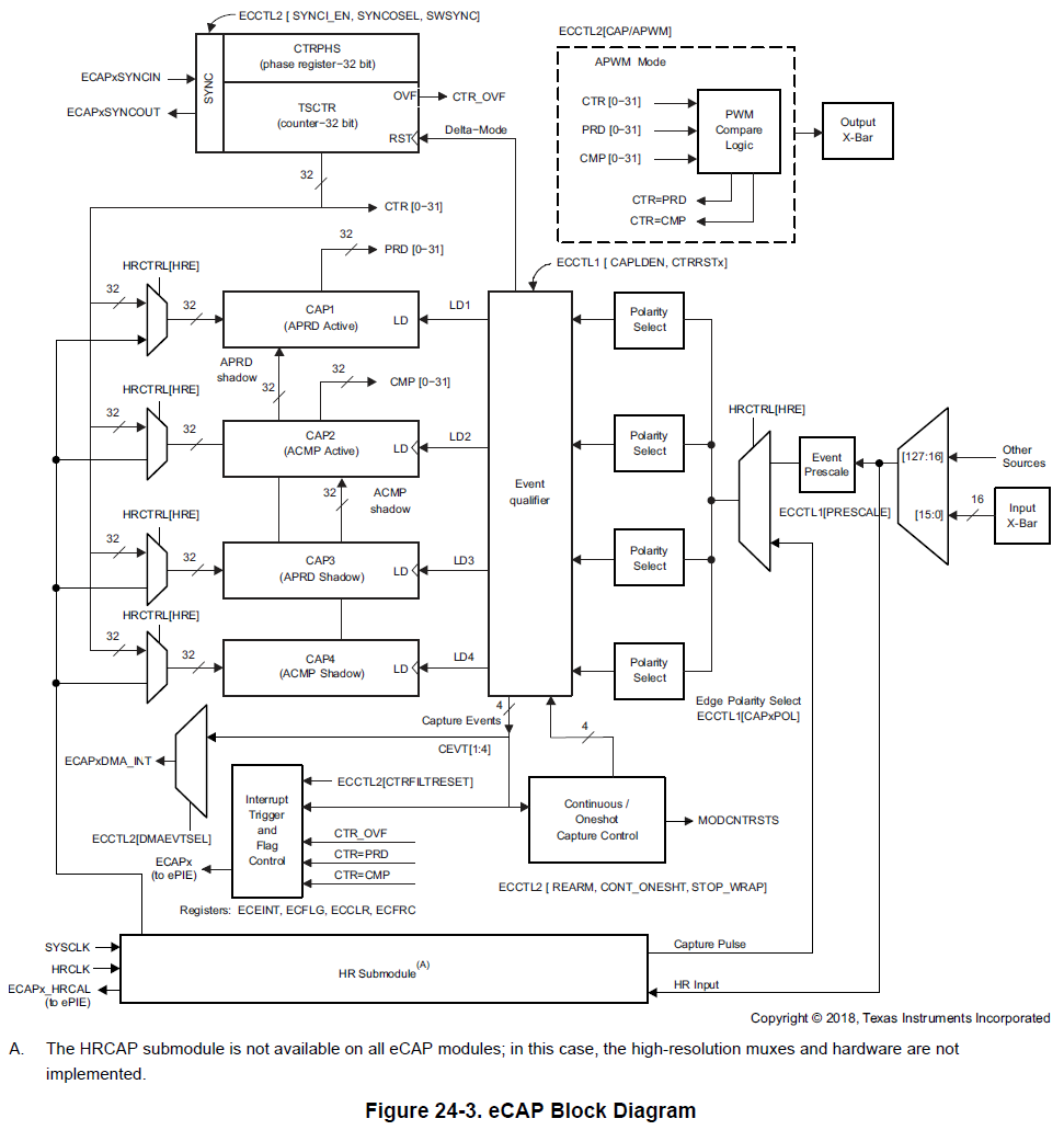 TMS320F28388D 칩에는 7개의 eCAP 모듈이 있다.