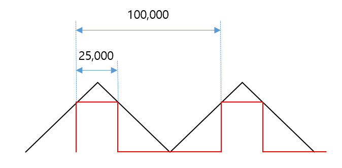 카운터가 up-dwon 모드일 때 PWM 파형의 주파수는 TBCLK/(2*period)인데 EPWMCLK는 따로 클락설정이 없으면 디폴트가 SYSCLK/2여서 100MHz니까 100,000,000 / 50,000 = 2kHz가 된다.