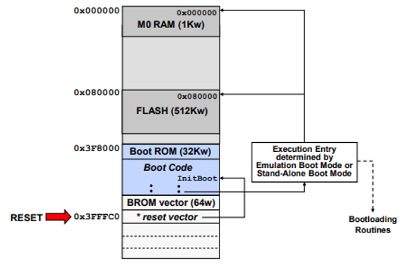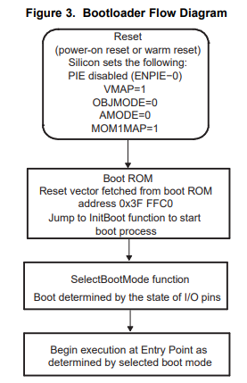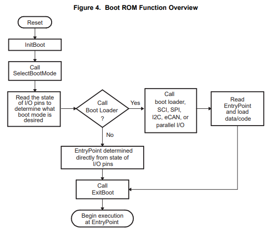Boot ROM은 한번만 프로그래밍 가능한 영역으로 공장 출하시 TI사가 부트로더 Software를 마스킹해둔 곳인데, 여기에 부트로더 역할을 하는 InitBoot 함수가 있다.