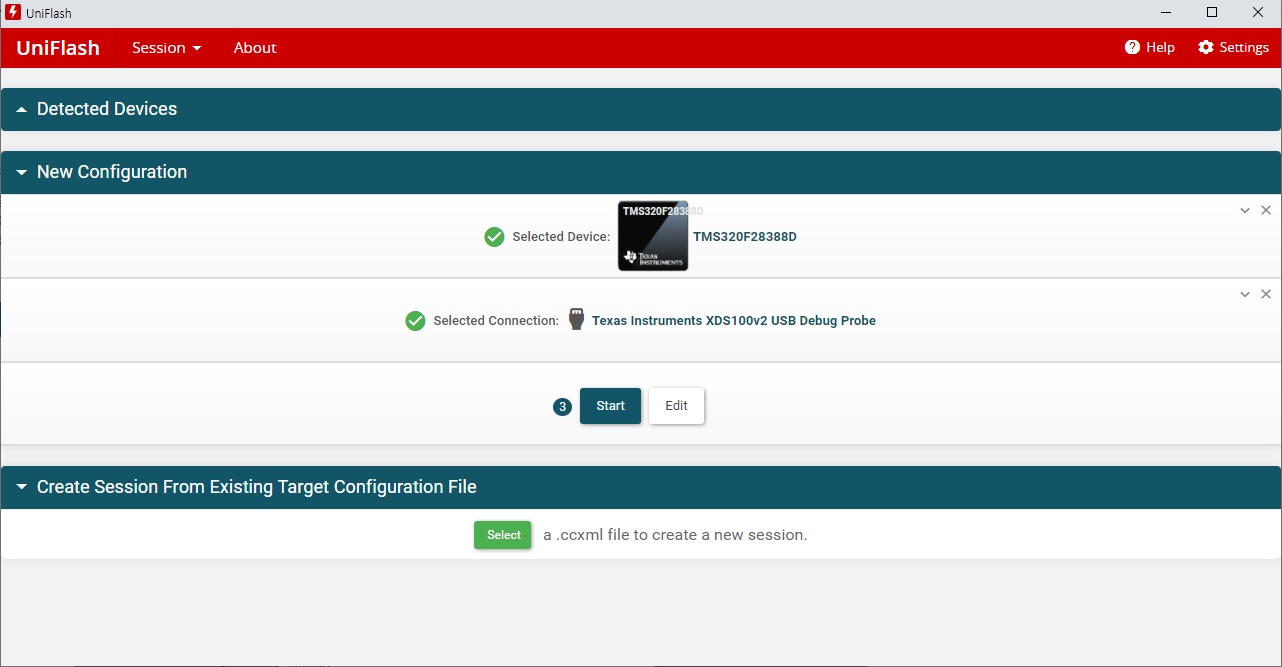 1. New Configuration tab에서 Device 및 Connection Select 후 Start