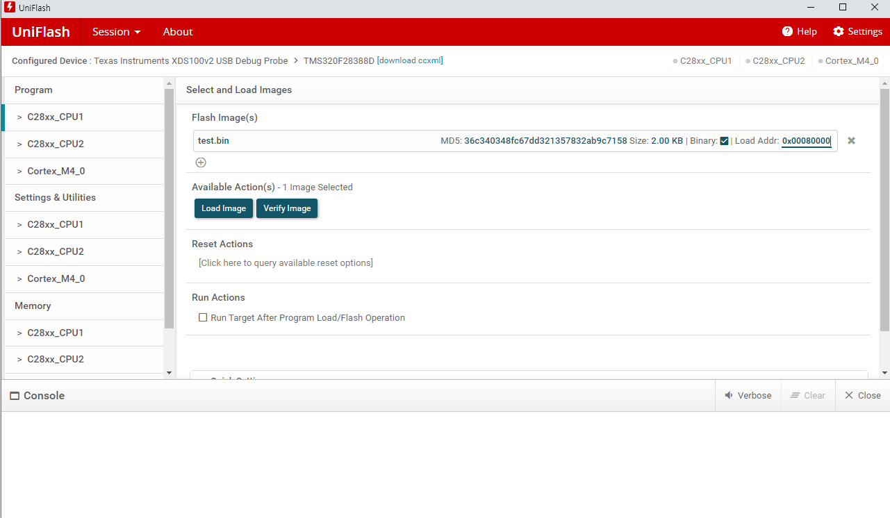 .bin 파일 사용하는 경우 : Binary에 체크, Load Addr 입력 (TMS320F2838x 칩의 경우 0x00080000)