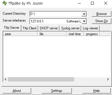 Tftpd64를 실행시키면 디폴트로 TFTP Server 서비스는 켜져있고, 서버 인터페이스는 디폴트로 127.0.0.1에 바인딩 되어있다. 디테일한 내용은 Setting 화면에서 설정할 수 있다.