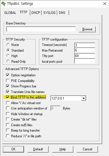 참고로 디폴트 디렉토리는 C:\Program Files\Tftpd64인데 권한 문제로 작동안할 가능성도 있으니 다른 폴더를 지정해주는게 좋다.