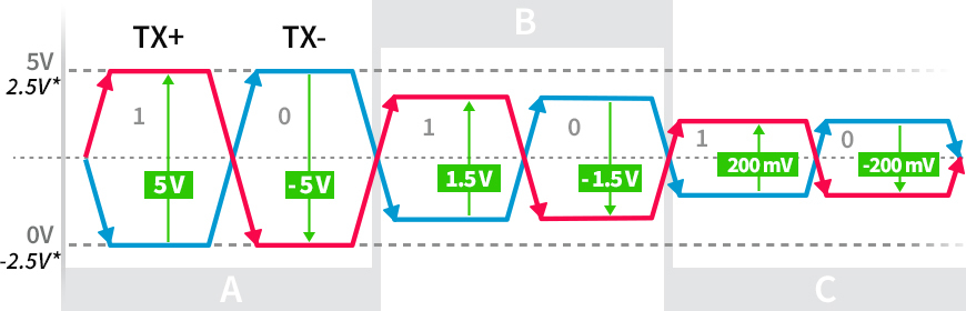 송신단에서 driver output은 보통 ±2V 이상이고, 수신단에서는 Rx+, RX- 두 라인의 전위차가 200mV 이상이면 로직 1, -200mV 이하이면 로직 0으로 판단한다.