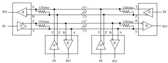 장거리 통신을 할 경우 케이블의 반사파에 의한 신호 왜곡을 방지하는 역할로 케이블의 특성 임피던스 값과 동일한 값의 저항을 선로의 종단에 연결한다. 선로의 중간에 연결할 경우 신호레벨이 작아지므로 반드시 선로 양 끝단에만 연결한다. 일반적으로 RS-422 (RS-485) 통신선로에 사용하는 종단저항은 120Ω을 사용하나, 케이블 길이 등 선로 상태에 따라 가감해주어야할 경우도 있다.