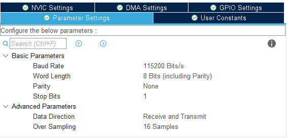 USART는 동기식 방식도 가능하다는 의미. Interrupt 방식으로 사용할 거기 때문에 NVIC Settings에 Enabled를 체크 해주었고 만약 Polling 폴링 방식으로 사용할 거라면 체크하지 않아도 된다. (참고. Polling 방식 사용시 Interrupt 방식과 달리 HAL_UART_Transmit 함수를 사용하고 마지막 매개변수로 timeout이 추가됨)