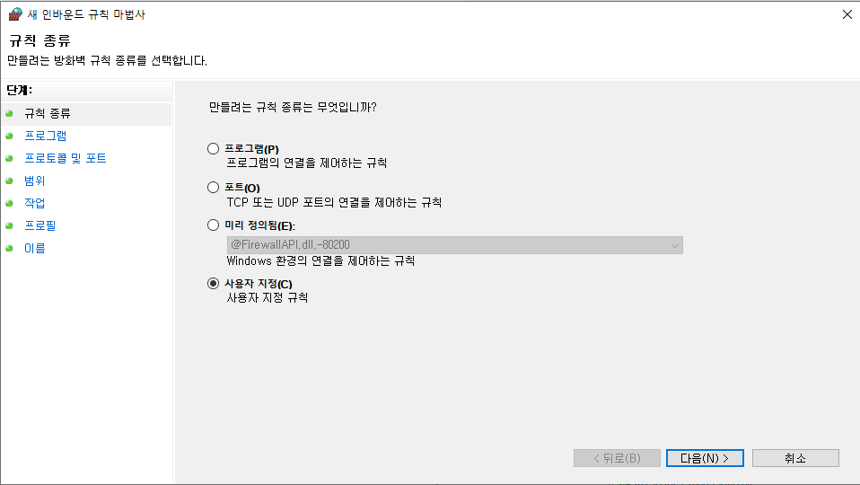 새 규칙을 추가하는 경우 사용자 지정을 선택하면 커스텀으로 규칙을 설정할 수 있다.