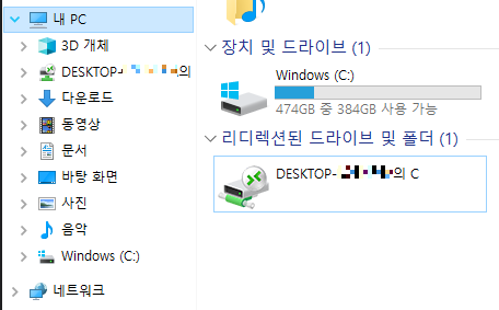 원격지 Host PC의 파일 탐색기 - 내 PC에 접근하면 Guest PC의 드라이브에 접근할 수 있다.