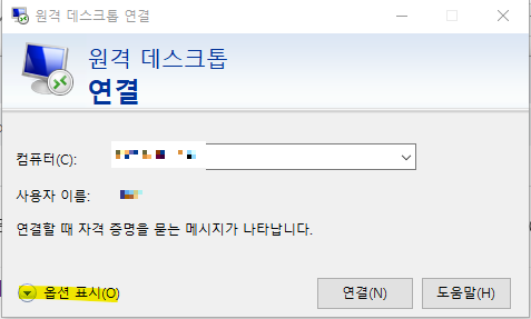 원격 데스크톱 연결에서 옵션 표시 클릭