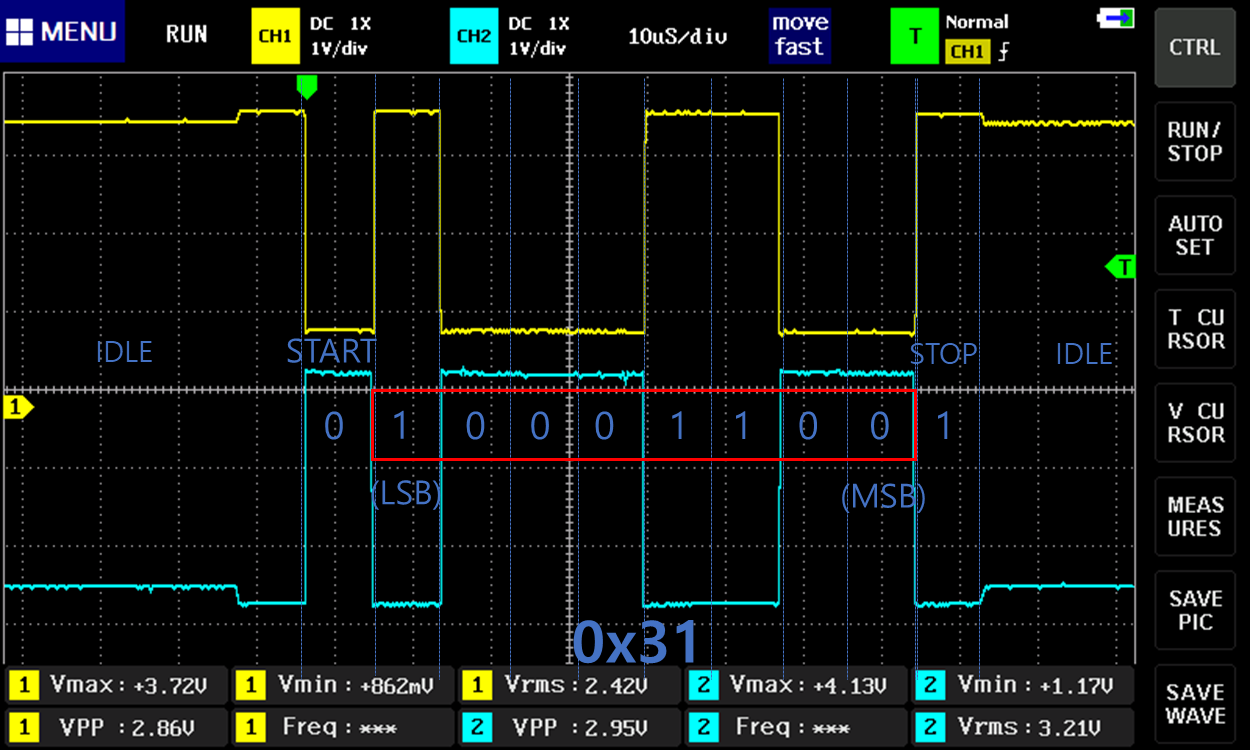 아래는 ASCII코드 '1'을 전송했을 때의 파형이다.