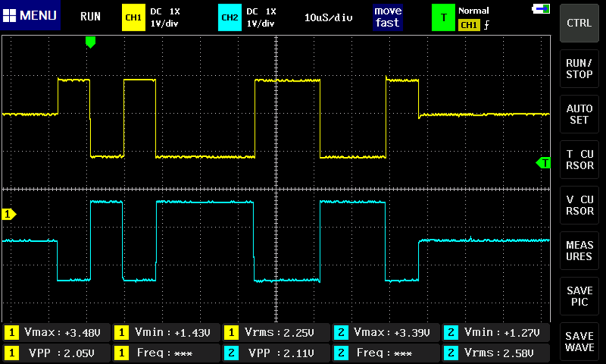 RS-422 은 두 개의 전압 신호 선을 사용해 데이터를 전송하는 Balanced(Differential) signaling을 사용하므로 Tx+와 Tx-를 측정한다. 일반적으로 양극성 신호라인을 A, 그 반대 극성의 신호를 B라고 하는데 아래 사진에서 노란색이 A라인(Tx+), 연두색이 B라인(Tx-)이다.
