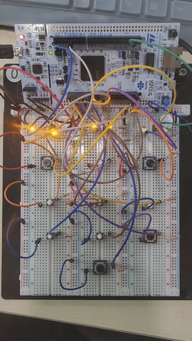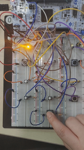 D플립플롭을 4개 연결한 시프트 레지스터이고 이전의 디지털 금고와는 달리 같은 클락펄스가 들어간다. 프리셋 기능은 EXTI (외부 인터럽트)를 사용했다.