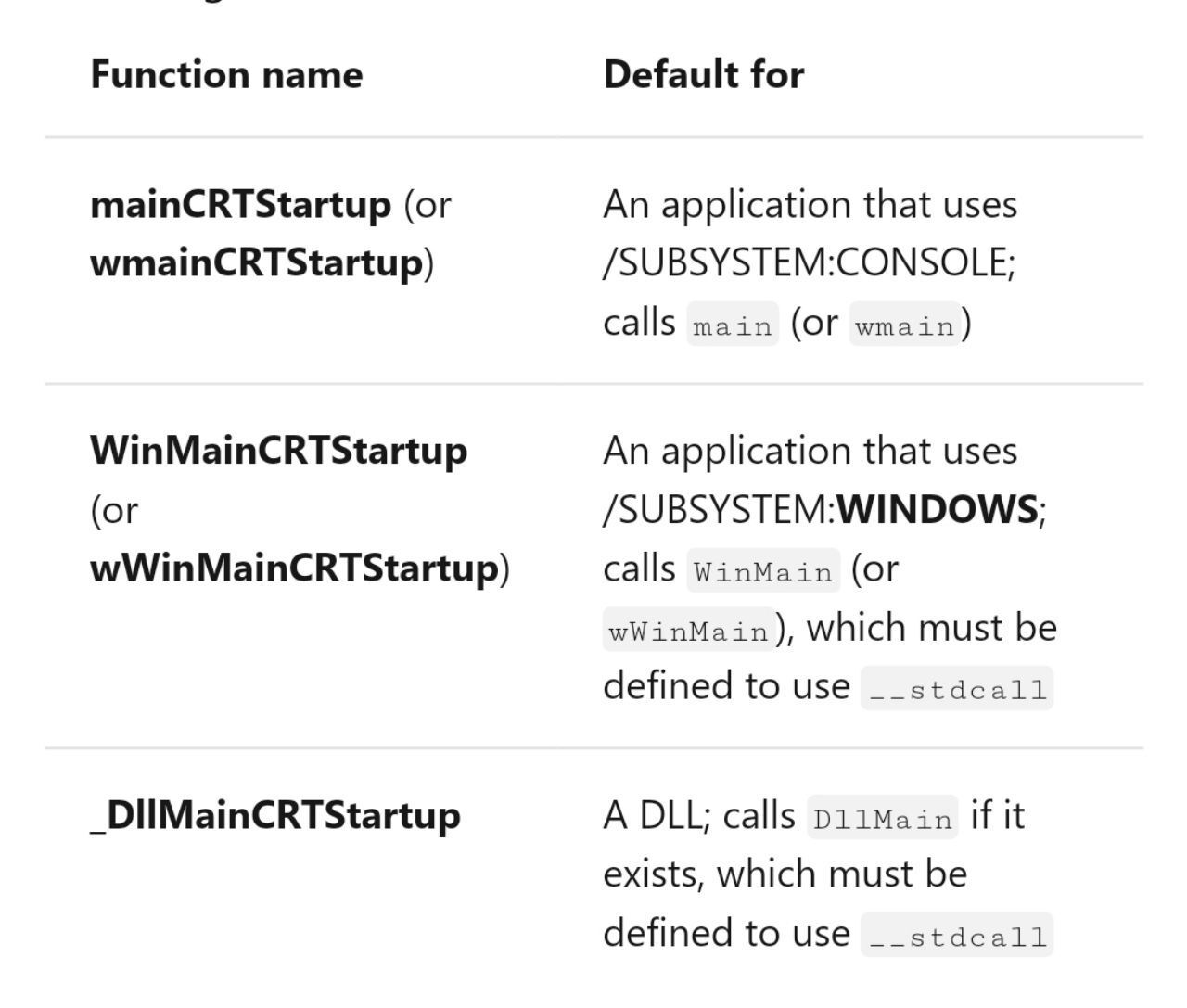 프로그램이 실행될 때 가장 먼저 호출되는 함수를 프로그램의 진입점(entry point)라고 하고, 이 진입점을 호출하는 함수는 C/C++ 런타임(CRT) 초기화를 담당하는 함수로 다양한 초기화 작업을 수행 한 뒤 main함수를 호출하는 역할을 한다.