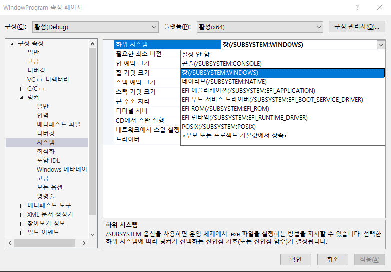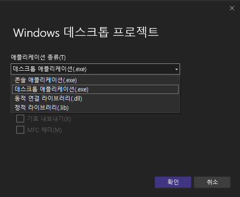 프로젝트 생성 시 콘솔 또는 데스크톱 애플리케이션을 지정하여 생성할 수 있으며, 이미 생성한 프로젝트를 콘솔 또는 GUI 애플리케이션으로 변경하려면 프로젝트 우클릭 - 속성 - 링커 - 시스템 - 하위 시스템에서 변경 가능하다.