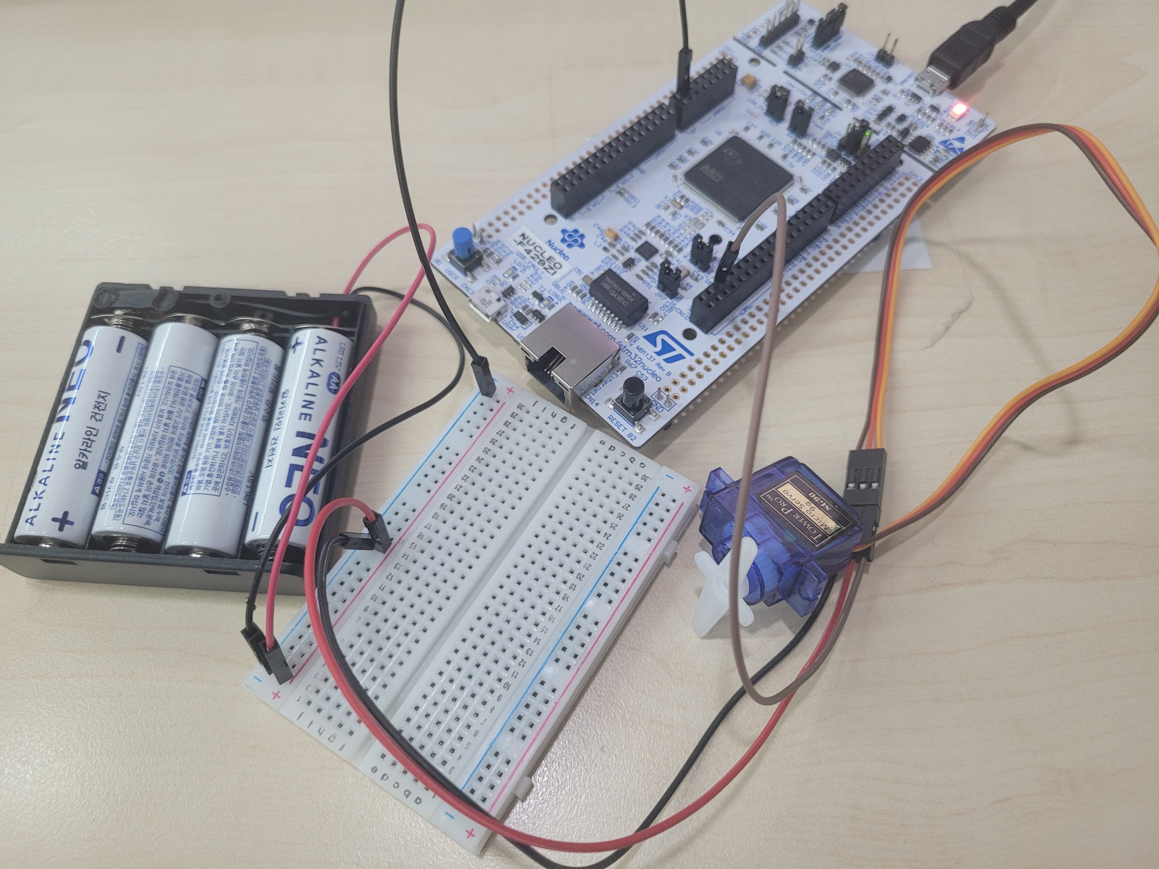 으로하고 만약 UART로 수신된 데이터가 '1' 이라면 "button pressed\n\r" 문장을 송신한 뒤, 듀티비를 50비율 씩 늘리고 최대각에 도달했다면 다시 최소각으로 간다. 그리고 버퍼에 0을 대입해 한번만 실행되도록 했다.