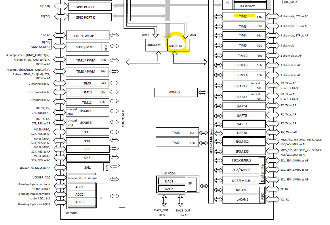 Timer 의 클락이 어떤 버스에서 제공되는지는 datasheet 20페이지의 블록 다이어그램을 보면 알 수 있다.