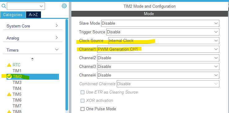 Internal Clock 소스로 설정해주고 PWM Generation CH1을 선택해준다.