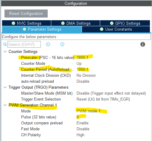 PWM 채널의 Pulse값은 나중에 소스코드에서 CCR (Counter Capture Register) 에 접근해 수정할 수 있기 때문에 위에서는 0으로 해두었다.