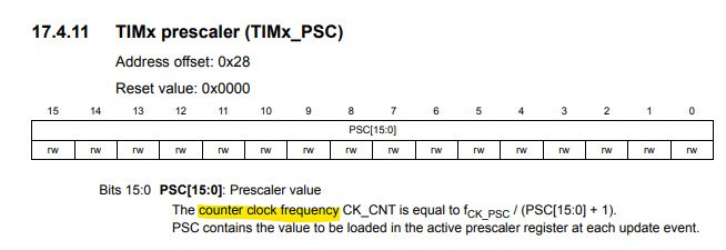 먼저 Prescaler는 타이머에 공급되는 클락을 내가 원하는 값으로 분주하는 것이다. 카운터 클락 주파수와 동일하다.