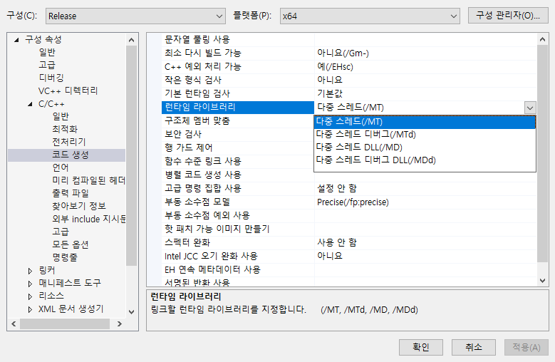 런타임 라이브러리도 실행파일에 포함시켜 배포하기 위해 /MD가 아니라 /MT 옵션으로 바꿔주는 것도 잊지 않는다.