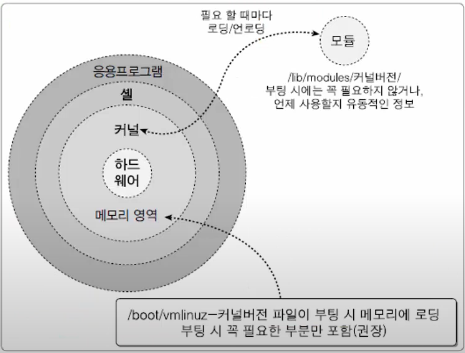 커널 모듈은 커널의 기능을 동적으로 확장할 수 있는독립적인 컴포넌트이다. 필요할 때만 메모리의 커널 공간에 로드되며, 커널의 재컴파일 없이도 커널 모듈을 통해 새로운 기능이나 드라이버를 추가할 수 있다.