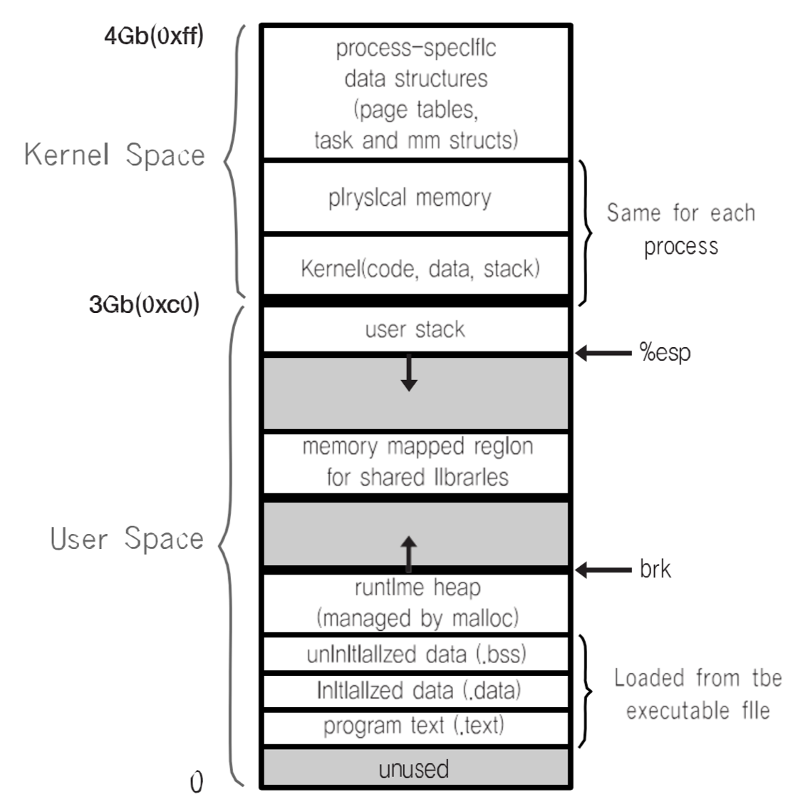 - 커널 공간: 상위 1GB (0xC0000000 ~ 0xFFFFFFFF) - 커널 및 커널 모듈이 사용하는 공간
