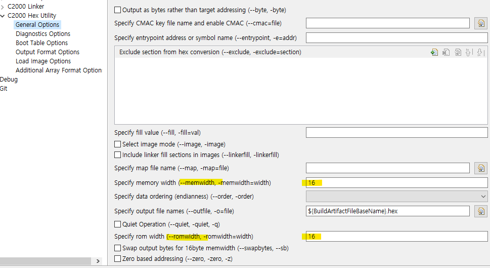 --memwidth, --romwidth 16으로 설정