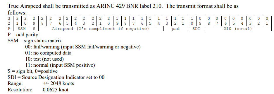 ADC(Air Data Computer)에 따라 그 세부적인 데이터 포맷은 다를 수 있지만 일단 Label 210은 True Airspeed를 BNR 로 전송하는데 쓰이고, 인터넷에서 흔히 찾을 수 있는 그 세부적 포맷은 다음과 같다.