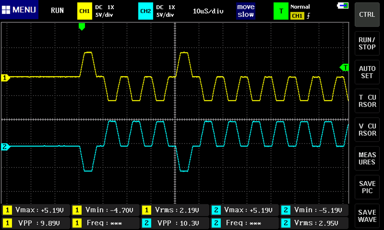 출력단에서 Vmax/Vmin은 ±5V 정도로 Vpp가 10V이다.