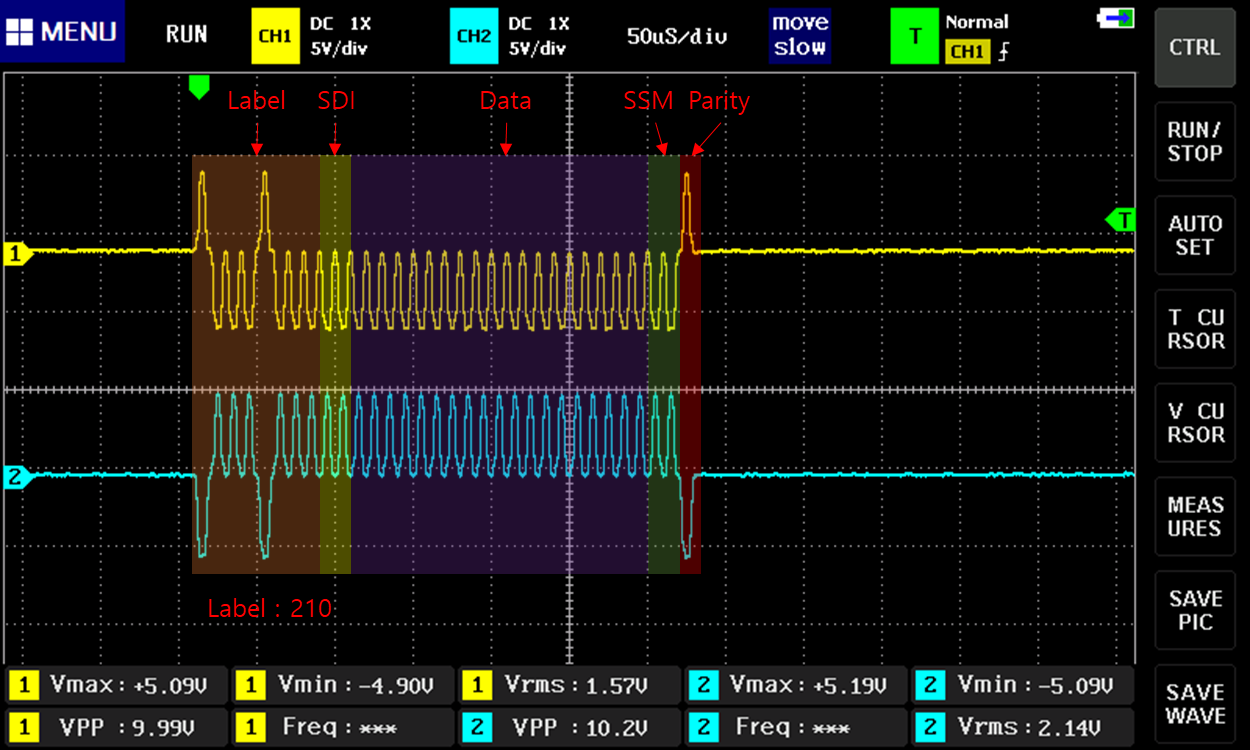 위 사진은 100kbps, odd parity로 Label은 210, SDI는 00, Data 값은 0, SSM은 00인 데이터를 전송한 파형이다.