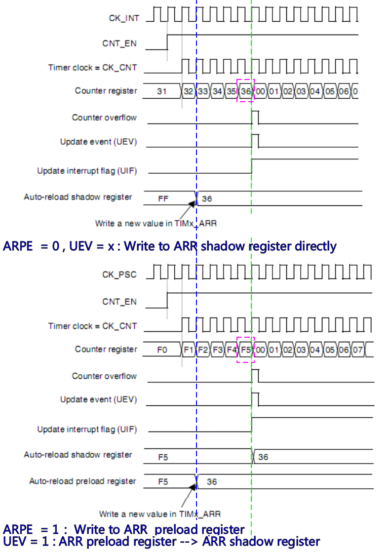 이런 상황을 위해 있는 기능이다. 내가 실행중에 조정한 ARR값이 바로 Auto-Reload 레지스터에 대입되는게 아니라 Preload 레지스터에 먼저 들어가서 문제가 없으면 대입이 된다.
