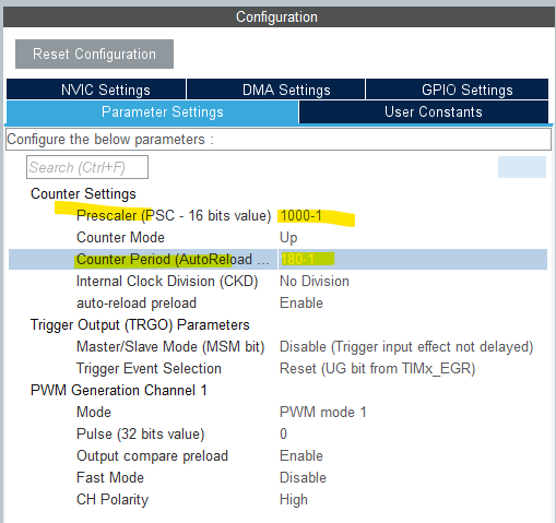 파라미터에서 ARR (Counter Period) 값은 앞으로 소스코드에서 계속 바꿀거긴한데 초기값은 500Hz로 해두려고 Prescaler를 180-1, ARR을 1000-1로 해주었다.