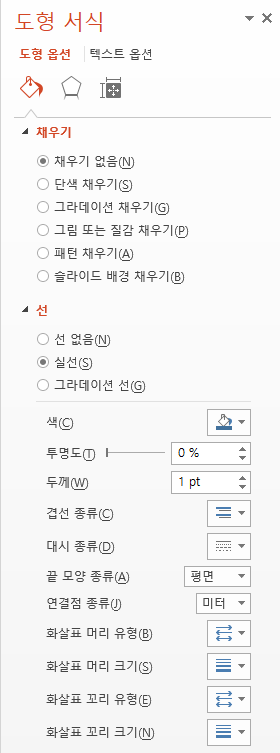 우클릭해서 도형서식에 들어가면 화살표 머리를 달아줄 수 있다.