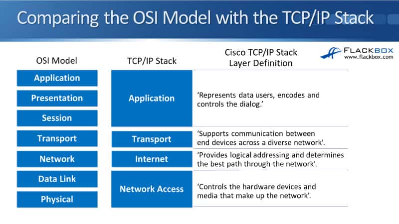OSI 모델과 비교될 수 있으나 OSI 모델이 개념적인 이해를 돕기 위해 사용된다면 현장에서 실제로 사용되는 것은 TCP/IP 스택이다.
