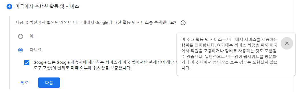 세금 ID 섹션에서 확인된 개인이 미국 내에서 Google에 대한 활동 및 서비스를 수행했나요? 아니요 선택