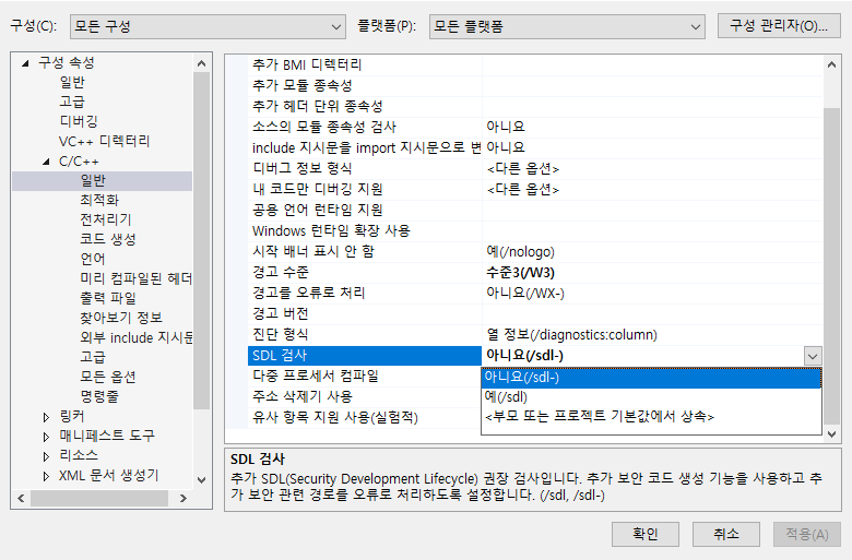 구성속성 > C/C++ > 일반 > SDL 검사 > 아니요 선택