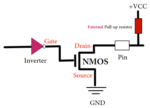 이러한 회로는 외부 전원과 풀업저항을 연결해서 사용해야하는데, MCU의 출력레벨인 3.3V가 아닌 레벨이 다른 전원 소스를 사용할 수 있게끔하여 유연성을 제공한다.