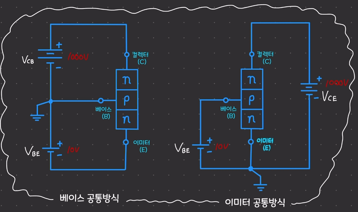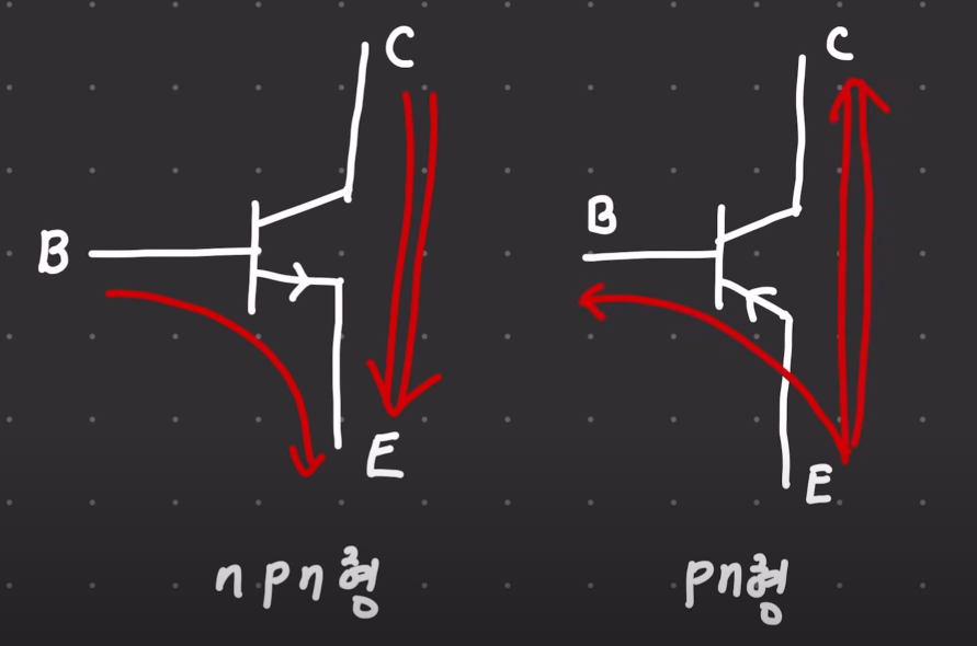 PNP형 : 베이스 전압이 이미터 전압보다 낮아서 이미터에서 베이스로 작은 전류가 흐르면 이미터에서 콜렉터로 더 큰 전류가 흐르게 된다.