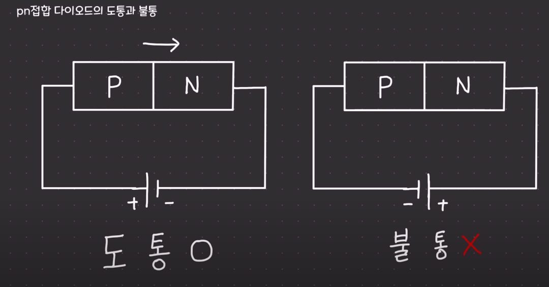 왼쪽이 순방향 결선. P형이 +극 N형이 -극에 연결된 상황