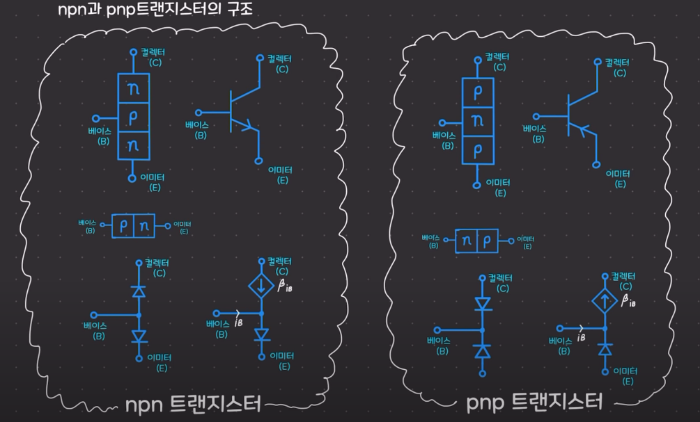 NPN : 전원이 컬렉터에 연결. 베이스와 이미터가 순방향. 그래서 베이스에서 이미터 방향으로 화살표.