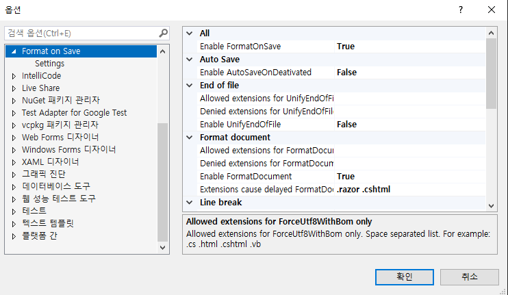 이후 도구 > 옵션 > Format on Save에서 디테일한 설정을 할 수 있다.
